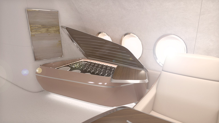 The project started when: “Camber Aviation Management and Alexander Craker were approached by a client with a passion for classic Italian motor yachts and bespoke British cars. The client wanted his soon-to-be acquired BBJ Max-7 aircraft to have a cabin that was inspired by his recently commissioned one-of-a-kind Rolls Royce, embodying the exquisite craftsmanship and luxuriousness for which Rolls Royce is renowned. The biggest challenge was to create a cabin that was both lightweight and graceful while capturing the hallmark substantial yet elegant look and feel of a Rolls Royce vehicle and the graceful lines of a classic Riva Aquarama boat.”